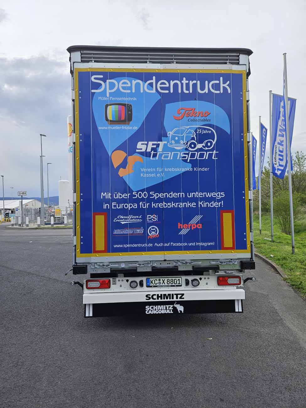 "Mit über 500 Namen unterwegs in Europa für krebskranke Kinder" - So steht es auf dem Heck des Schmitz Varos Mega SCS. Seit dem Beginn der Planungen im Mai 2022 vergingen viele Telefonate und hunderte Emails, aber es entstanden viele Kontakte und gute Freundschaften. Nach einem holprigen Start zum 1. Juni wuchs die Anzahl der Buchungen langsam, aber stetig an, bis Mitte August aufgrund von Mailings der beteiligten Firmen und einer Social Media Aktion der Bekanntheitsgrad des Spendentruck durch die Decke ging. Im Oktober wurde der Entschluss gefasst, aufgrund der Anzahl der Buchungen die Namen beidseitig zu verteilen und das Design anzupassen, was aber bereits einige Wochen später verworfen wurde. Denn Ende November war der Spendentruck fast komplett ausverkauft und über 500 Namen mit an Bord.